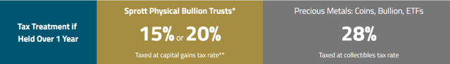 As seen above, Sprott is taxed at almost half the rate of physical coins, bullions, and ETF’s. The 15% tax rate is for single investors who earn less than $400,000 and married investors who make a combined household income of less than $450,000. This is a significant advantage as investors are allowed to keep 8-13% more of their profit for owning this trust.