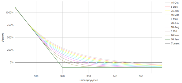 Of course, liquidity constraints make this impossible to do with a large position and that may be for the best. But, for those with small accounts, I honestly believe that put options on SPXL are the best way to hedge the market considering the likely drawdowns in the fund. Today, a January 2021 put option on SPXL has a bid of $0.45 and an ask of $2.00. The previous close was $1.23, so let’s say you could get in at $1.5. Here would be the performance of the option as it crosses below $20.