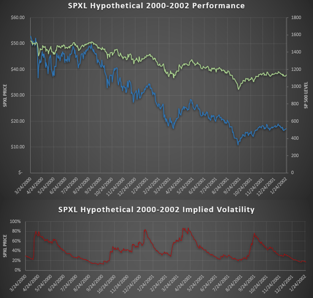 A 2000-2002 style bear market would be much less painful for SPXL investors, but still wipe out most of their position. This bear market was a bit longer than 2007-2009 and was a nice slow downtrend with occasional violent spurts instead of a terrifying discontinuous drop as in 2008.