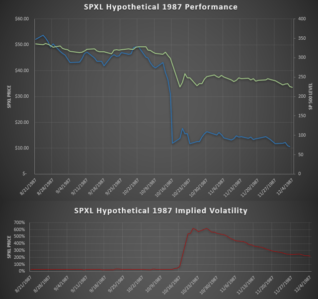 Compared to the other two, the 1987 stock market crash was extremely short and really only occurred in a matter of days from October 9th to October 22nd of 1987. Still, this crash would have likely resulted in the largest increased in SPXL’s implied volatility. Take a look at the chart below: